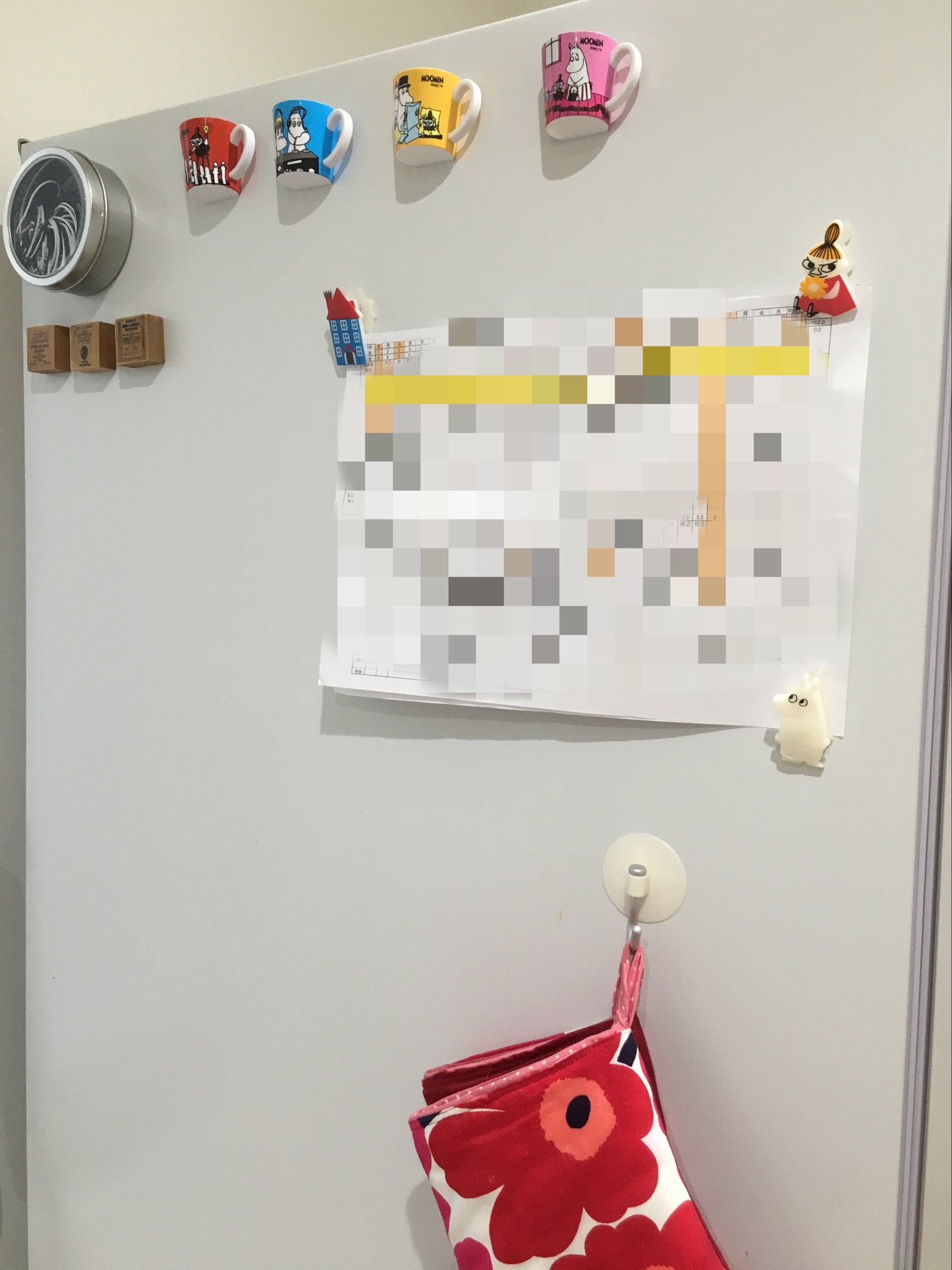 ムーミンのマグネットクリップで貼っているのは私の勤務表です。